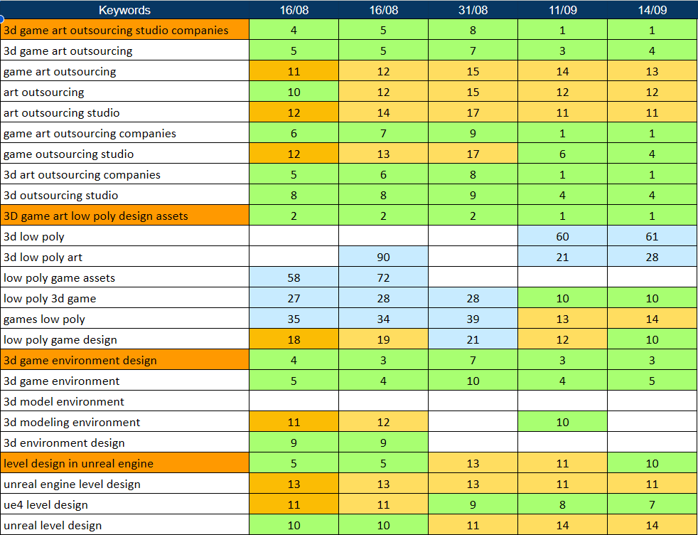 - Mục tiêu: Top 1 – 5 từ khóa về dịch vụ “game art outsourcing“.