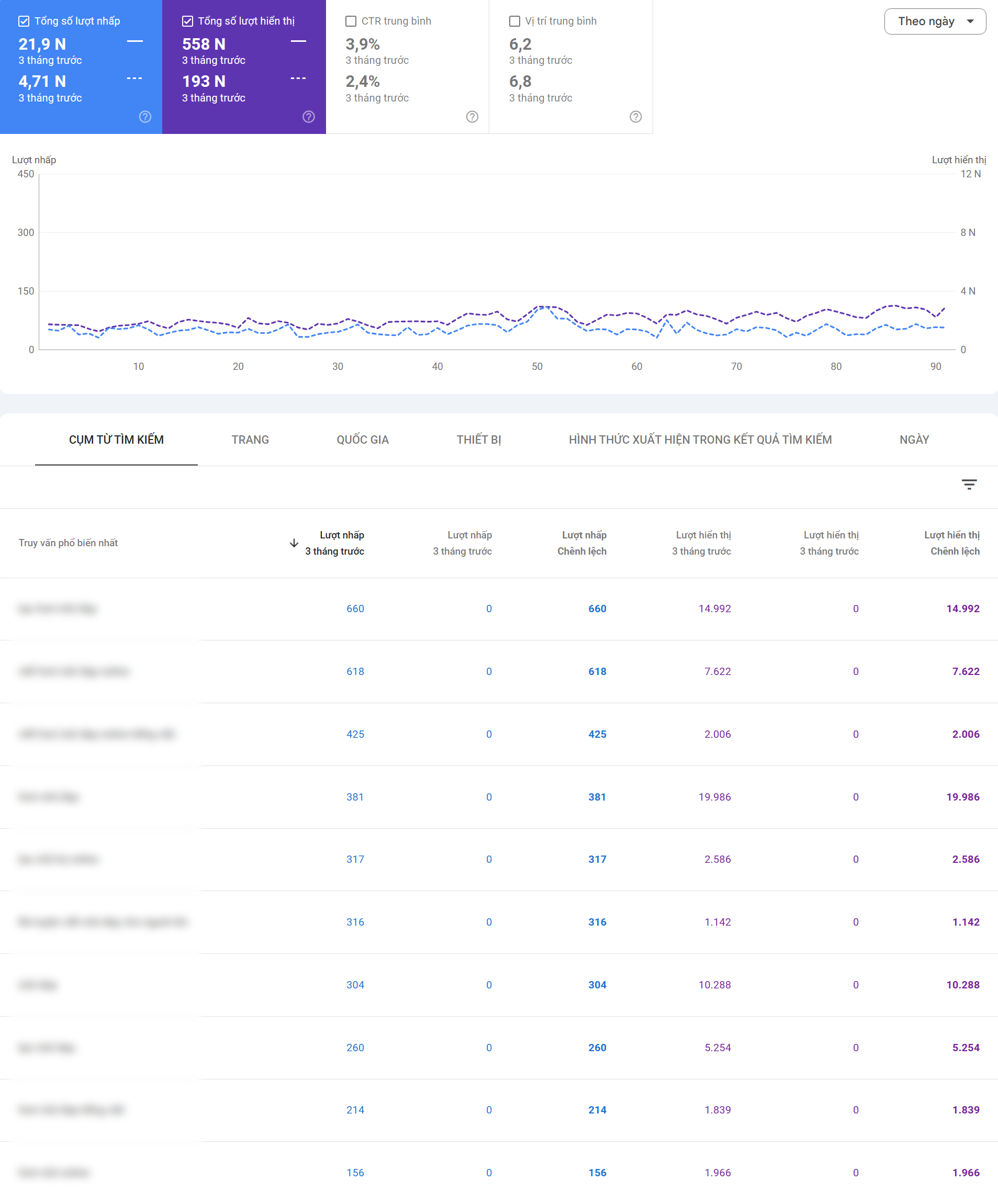 So sánh dữ liệu trong 3 tháng gần nhất với 3 tháng trước đó: