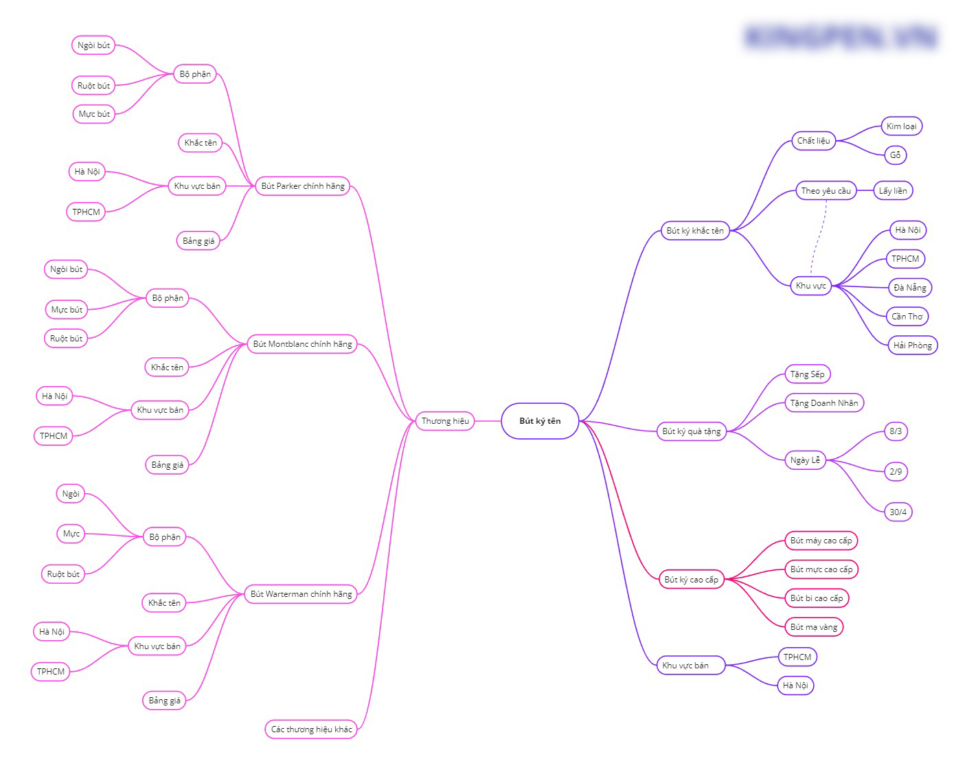Ví dụ với chủ đề “bút ký quà tặng”, hệ thống tiếp tục chia thành: