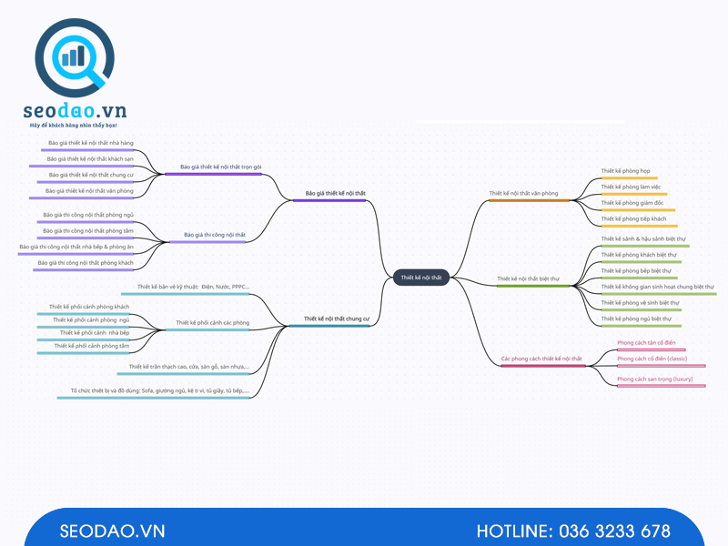 Xét trên góc độ chiến lược SEO, bên cạnh việc tối ưu về từ khóa “giá thiết kế nội thất”, chúng ta cần xây dựng hệ thống thông tin đầy đủ về dịch vụ. Mình sẽ sử dụng mô hình content Topic Cluster để trình bày và điều hướng người dùng tham vấn các thông tin từ doanh nghiệp.