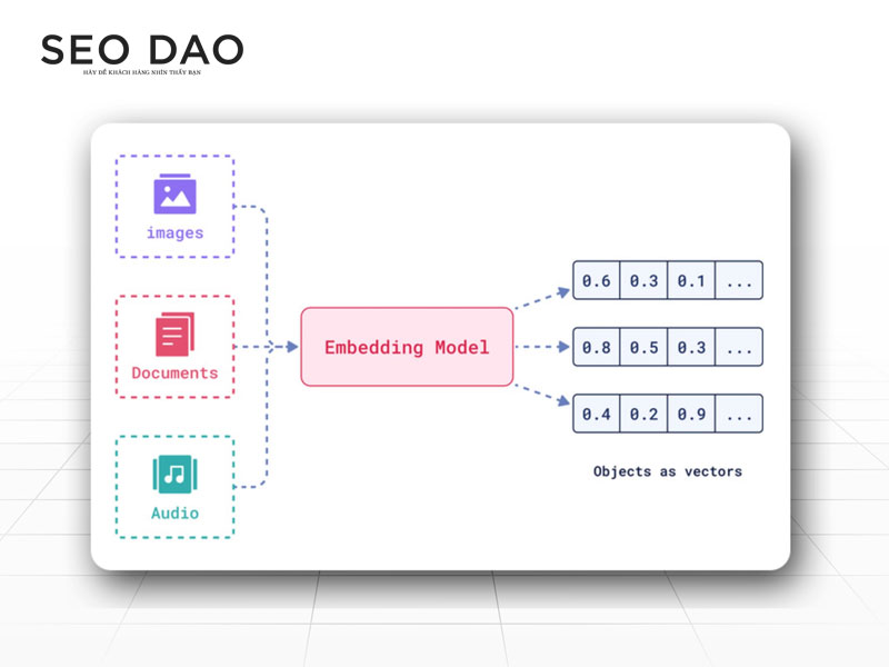 Đây là quá trình biến đổi dữ liệu phi cấu trúc (văn bản, ảnh, âm thanh) thành dạng số hóa mà AI có thể tính toán và so sánh: