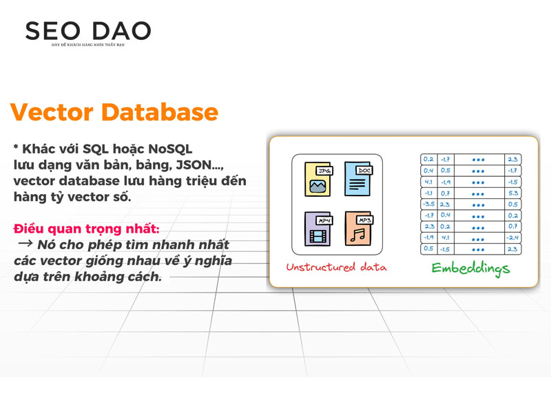| Lưu trữ dưới dạng văn bản, bảng, JSON, Key-Value. | Lưu trữ dưới dạng các Vector số (mảng số nhiều chiều). |