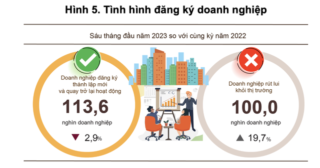 Tính chung 6 tháng đầu năm 2023, số doanh nghiệp tạm ngừng kinh doanh có thời hạn 60.200 doanh nghiệp (tăng 18,2% so với cùng kỳ năm trước); 31.000 doanh nghiệp ngừng hoạt động chờ làm thủ tục giải thể (tăng 28,9%); 8.800 doanh nghiệp hoàn tất thủ tục giải thể (tăng 2,8%). Như vậy sau nửa đầu năm 2023 đã có 100.000 doanh nghiệp đóng cửa (16.700 doanh nghiệp đóng cửa mỗi tháng).